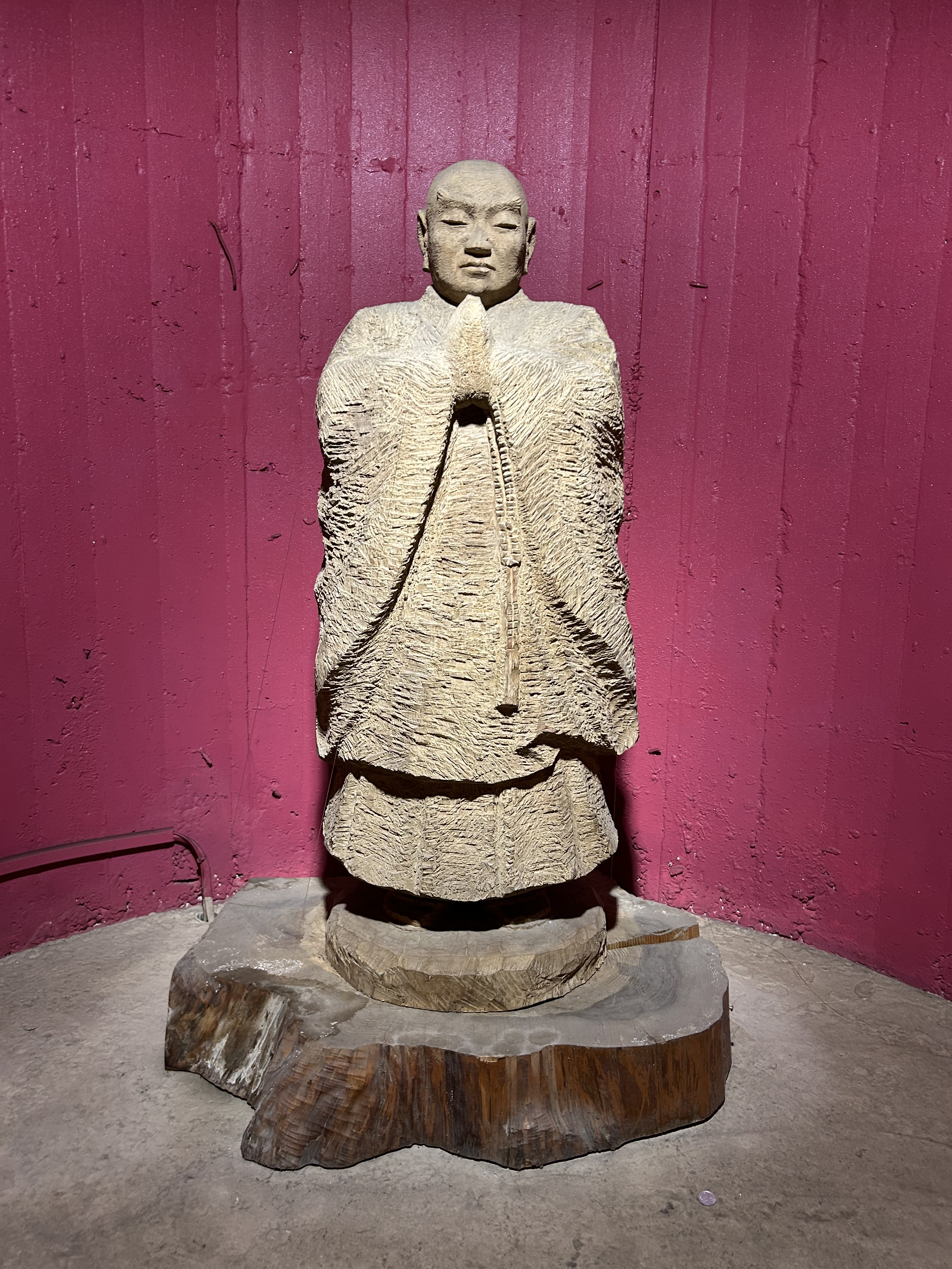 Each statue is carved from a single block of wood by sculptor Kou Hasegawa (1909-2012), another Chiba native. Traditionally, wooden Buddhist statues are comprised of several carved pieces carefully assembled to make the whole. Hasegawa’s style of using a single block of wood is said to emulate that of the prolific seventeenth century sculptor monk, Enku.