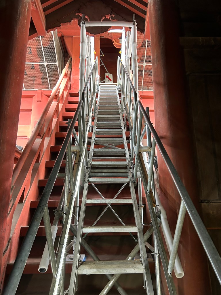 The Sanmon sits in a north-south orientation, with the temple to the west of the entrance. There is a ground level chamber anchoring each end of the Sanmon and visitors to the upper chamber enter from inside the gate itself through the chamber on the north end.