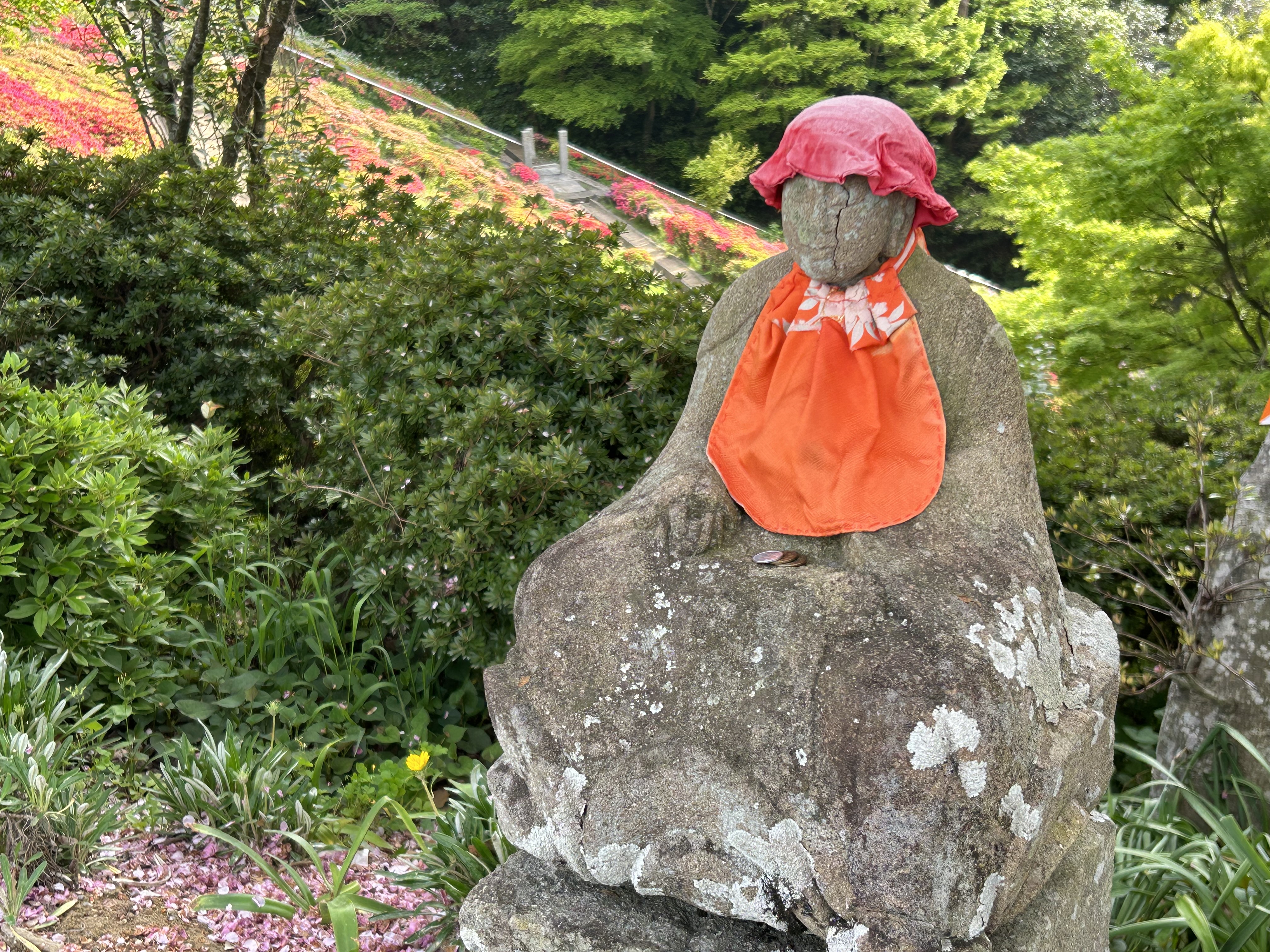 The modern Chinkokuji is a major establishment halfway down the mountain, laid out similar to the above image. It commands an expansive view over the valley below. Although it is now possible to drive up the mountain behind the temple, the pedestrian approach from below is a long flight of stone steps, flanked by well-groomed azalea bushes.