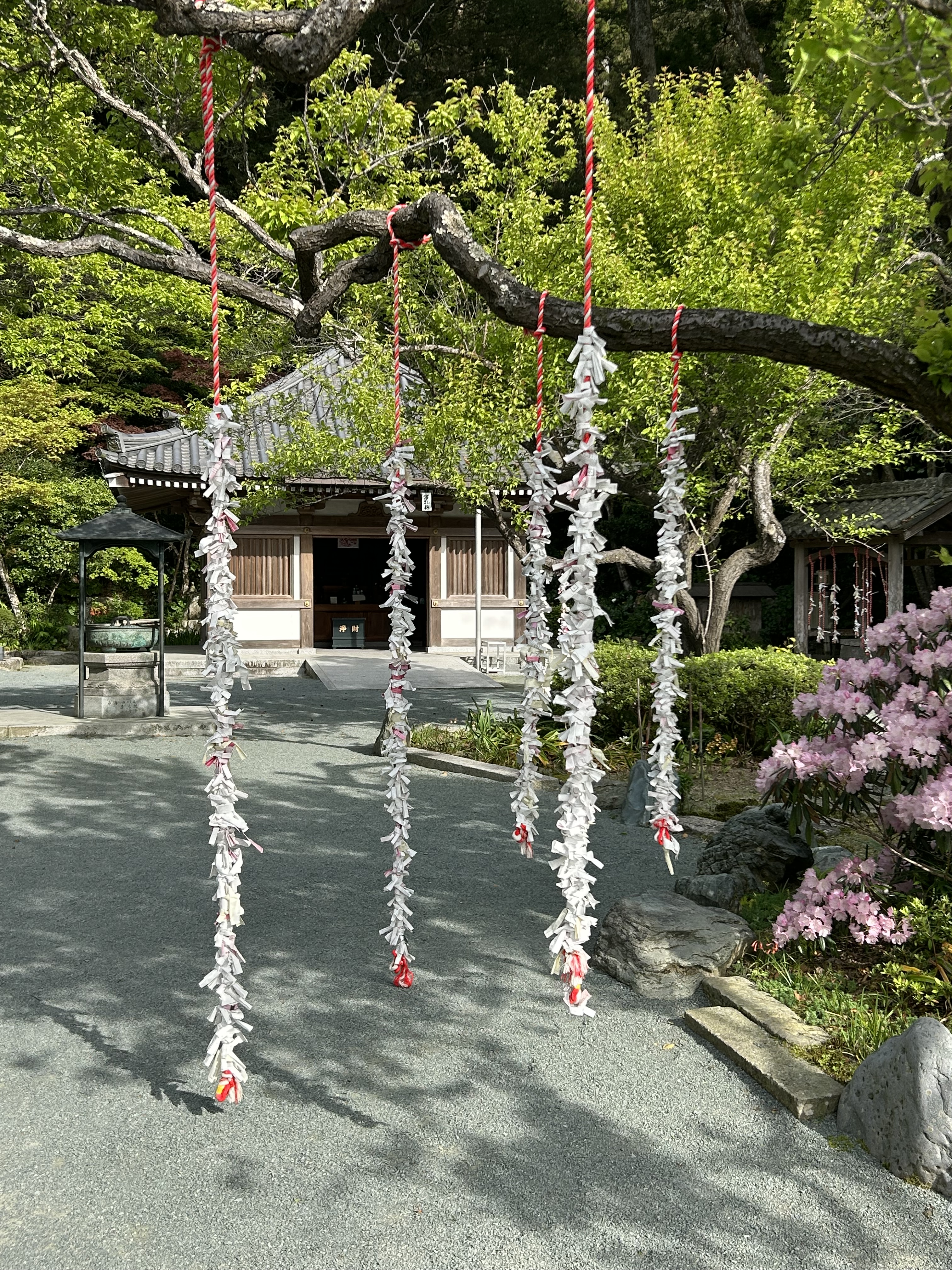 Nearly every shrine and temple across Japan sells o-mikuji (fortunes) and Chinkokuji is no exception. What is unusual is the way in which those fortunes are left behind at Chinkokuji. In most places there is a special rack where people leave the fortunes, a way of ensuring that the good they contain will transpire while any negatives cannot follow the person home. Alternative, people tie the fortune paper to the small branches of a tree. But at Chinkokuji, they tie the fortunes to suspense cords.