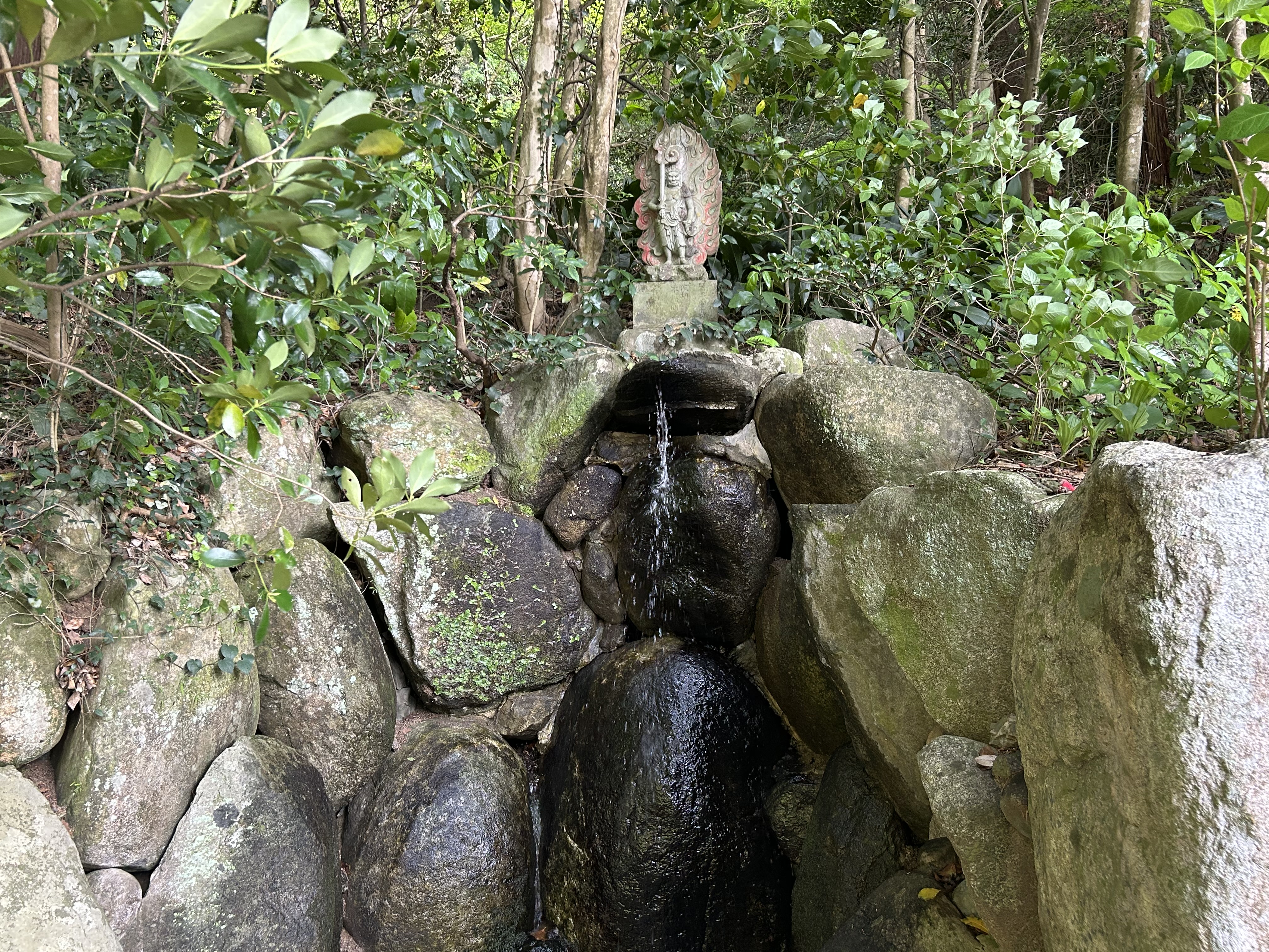 As is often the case with early Buddhist temples in Japan, the original temple was consecrated inside a small cave about a 10 minute walk above the current site of the temple (ie, upper right hand corner of the above image). Now known as “Oku-no-in”, even the temple brochure refers to it as a “power spot”, presumably one reason Kukai chose it as the site of his temple.