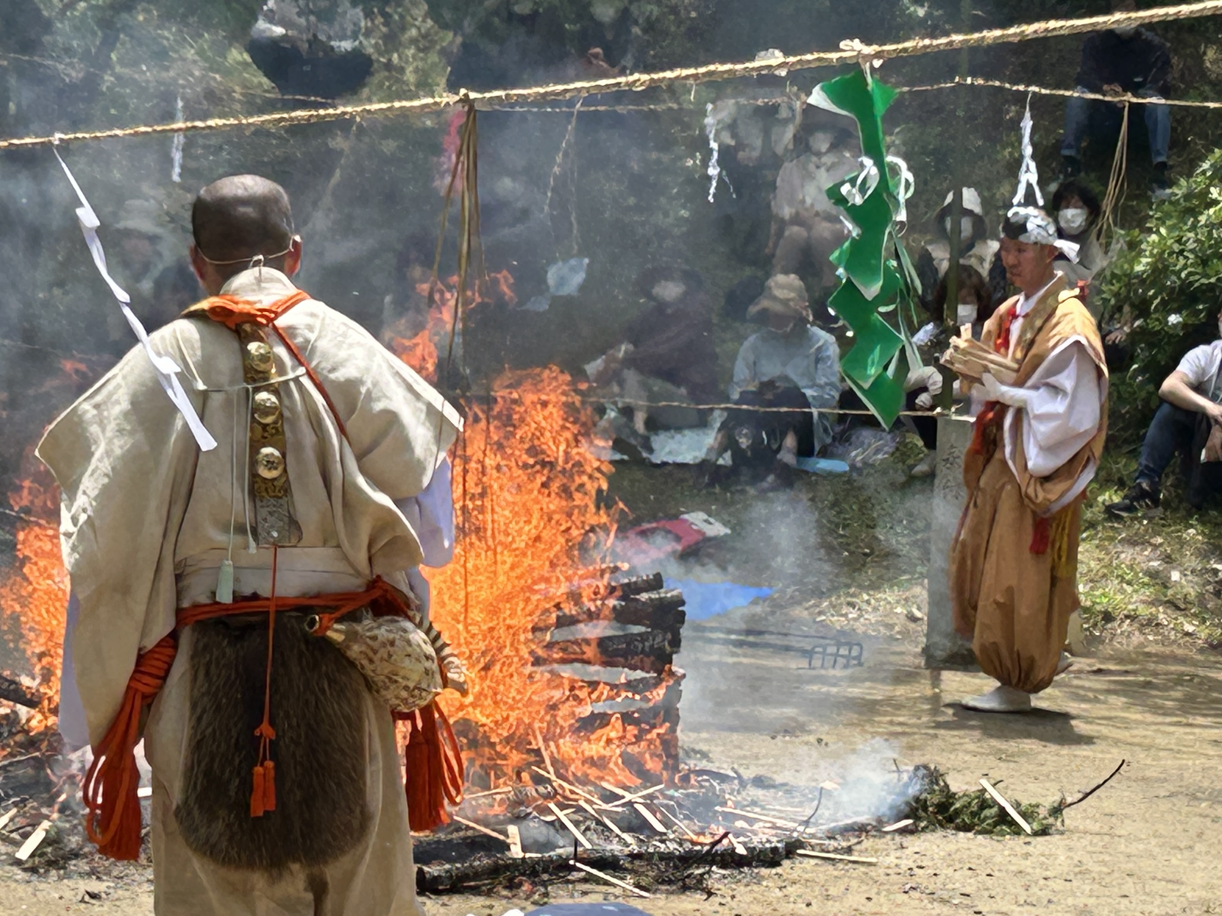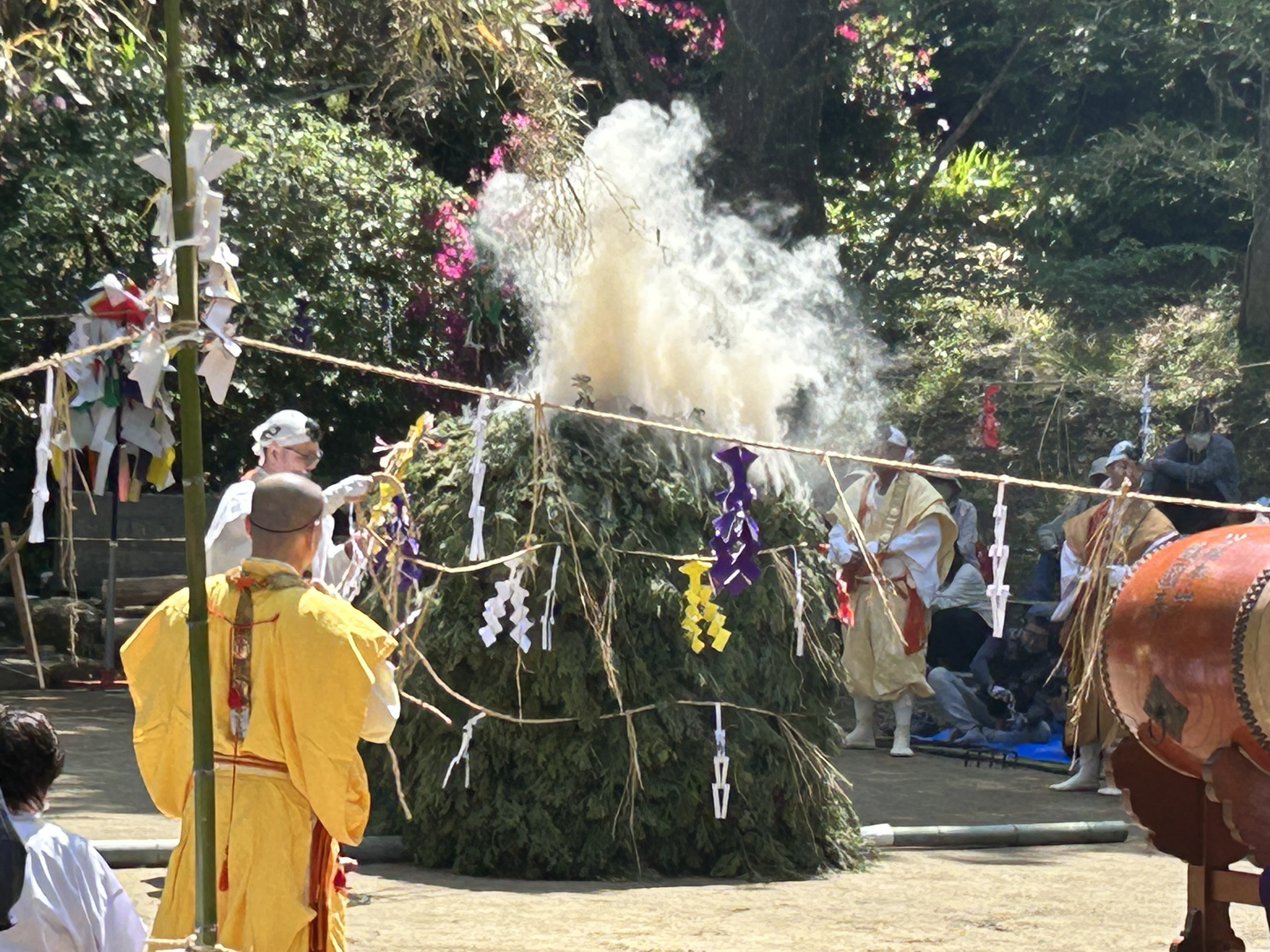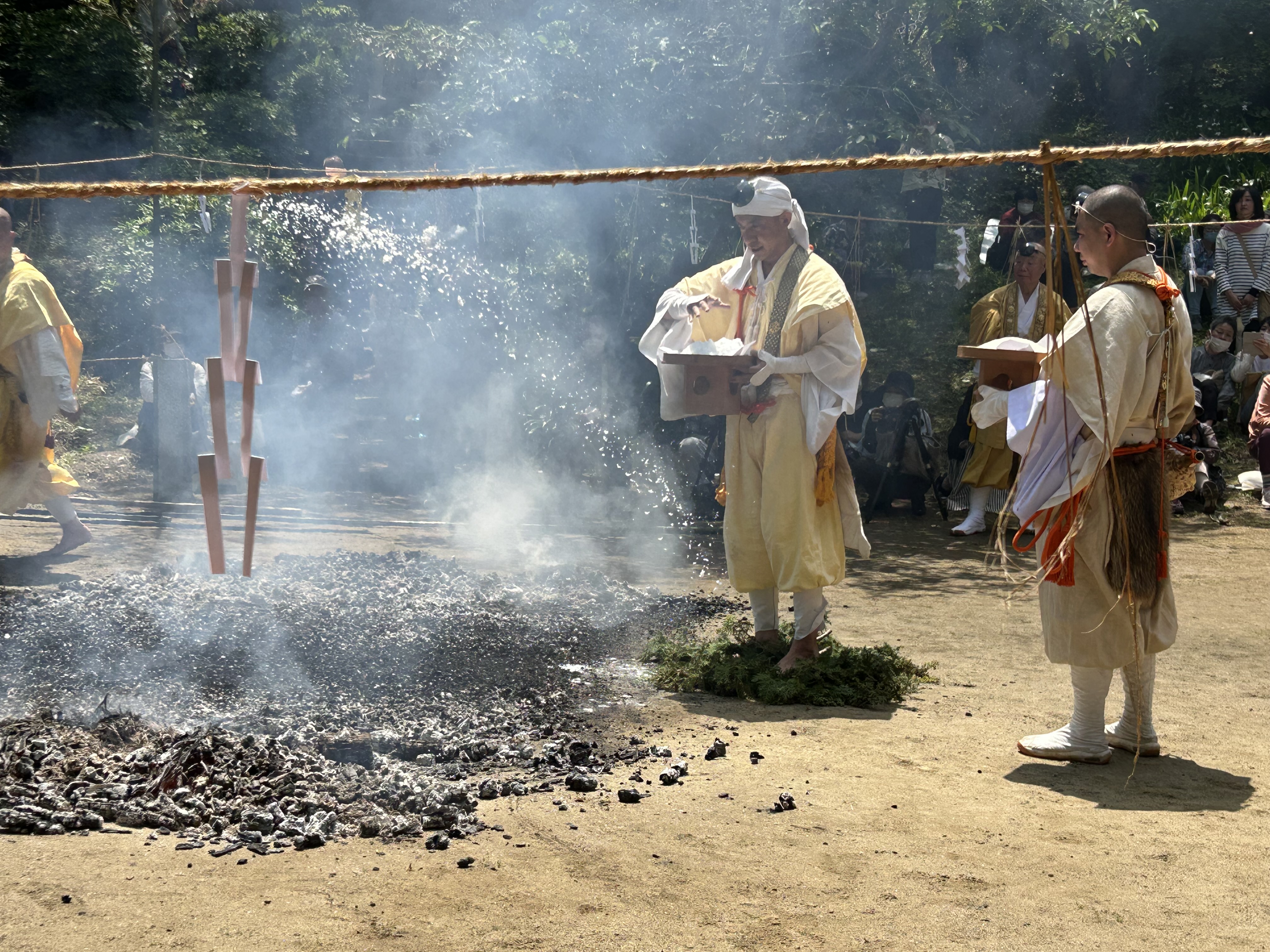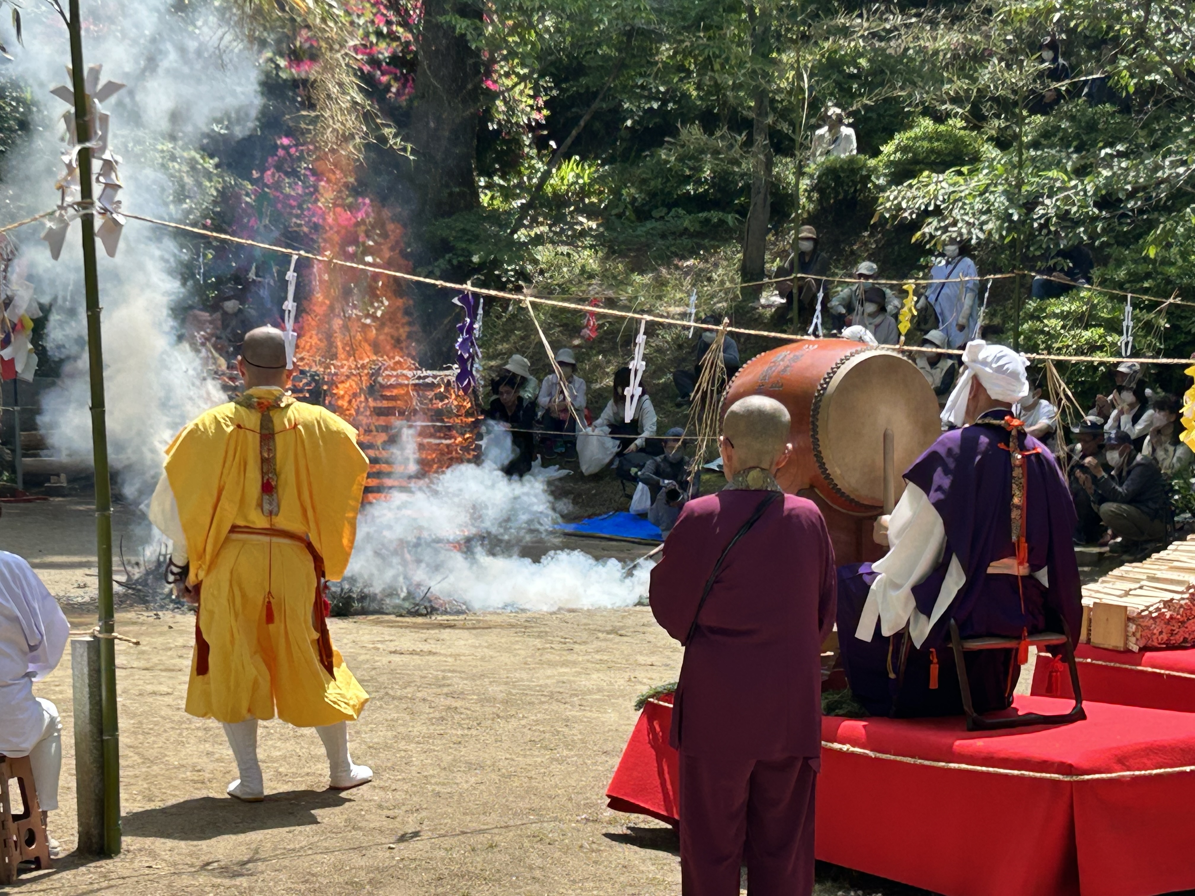 In the ceremony, a number of priests in yamabushi (mountain ascetic) garb, together with the head priest, process from the Gomado to the fire site and proceed to conduct various purification and blessing rituals. Eventually a large fire is lit, smoke from green cedar boughs billowing into the air. The fire is carefully tended as the flames soar and it then burns down. Prayers written on small wooden tablets are added to the fire as it burns, again for the purpose of sending those prayers skyward. All the while, sutras are chanted to the beating of a drum.