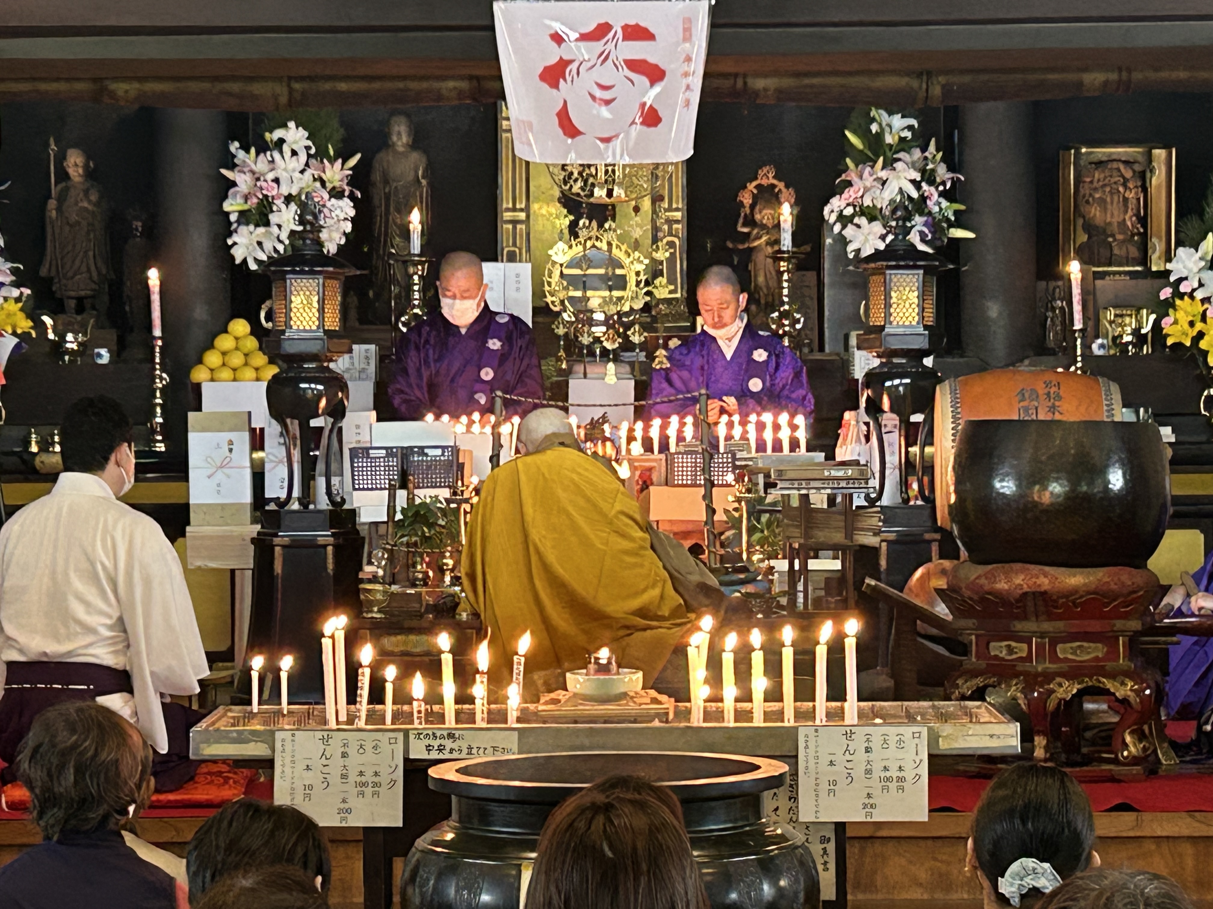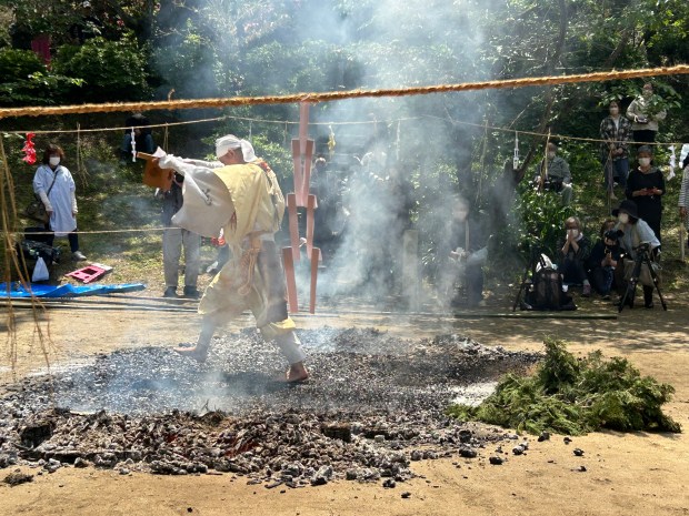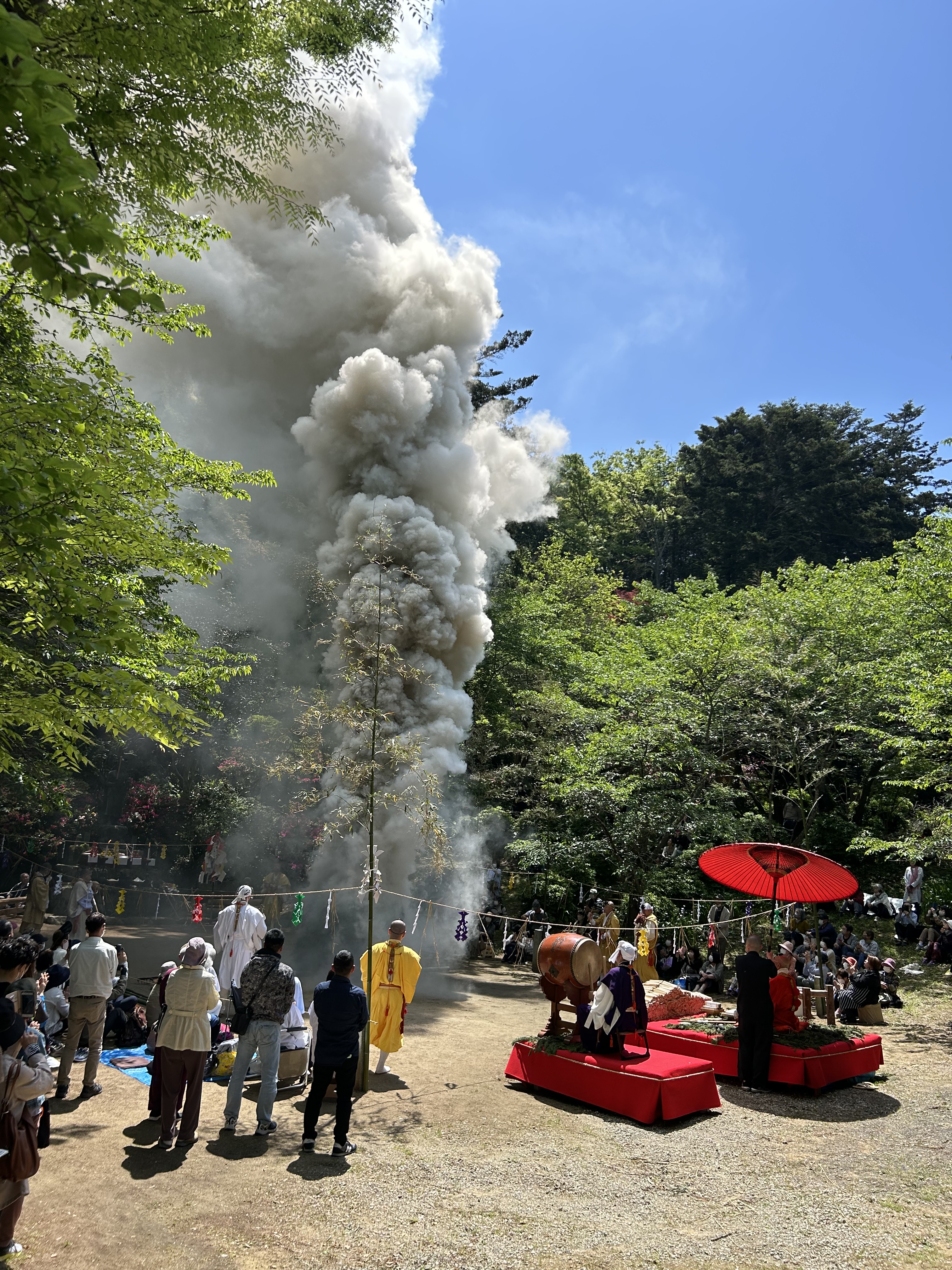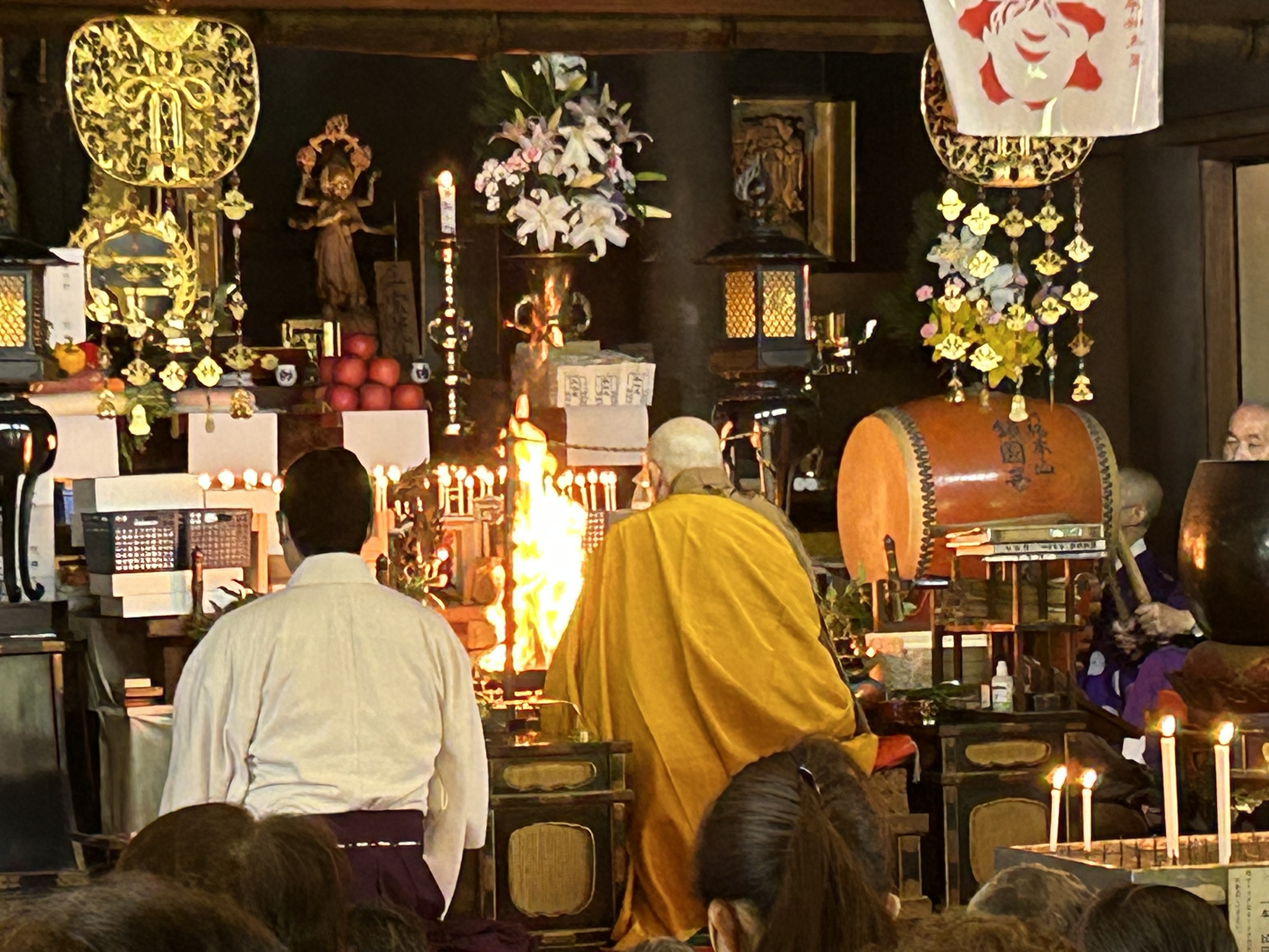 In the ceremony, a number of priests in yamabushi (mountain ascetic) garb, together with the head priest, process from the Gomado to the fire site and proceed to conduct various purification and blessing rituals. Eventually a large fire is lit, smoke from green cedar boughs billowing into the air. The fire is carefully tended as the flames soar and it then burns down. Prayers written on small wooden tablets are added to the fire as it burns, again for the purpose of sending those prayers skyward. All the while, sutras are chanted to the beating of a drum.