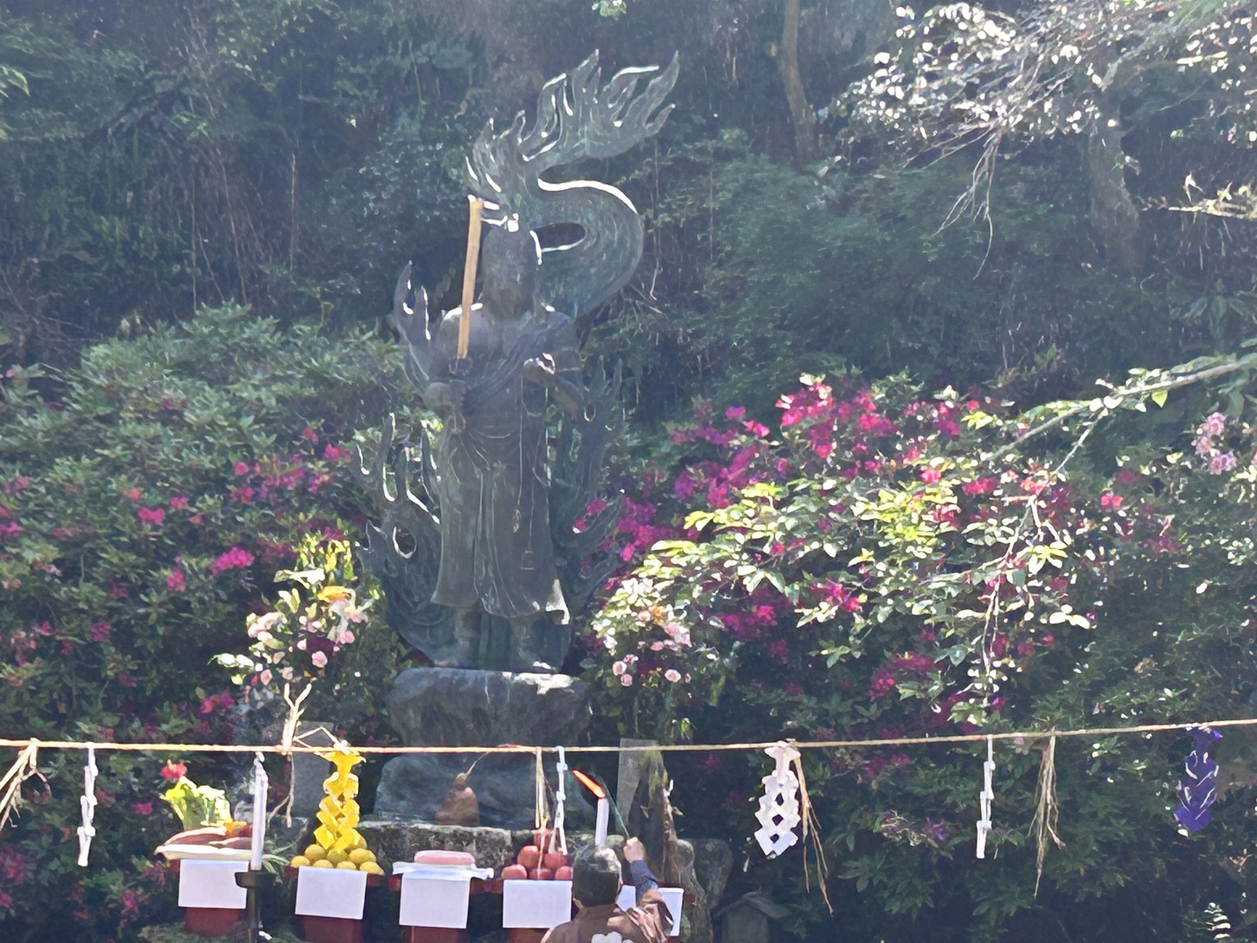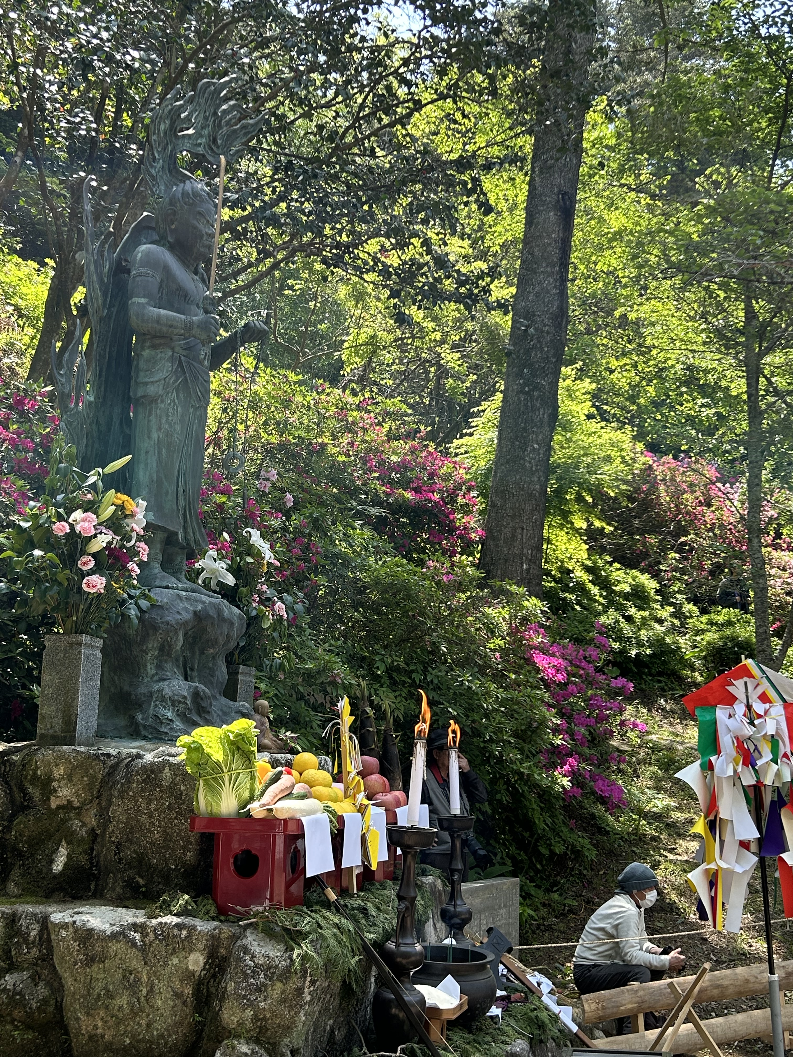 In a small clearing below the central temple complex, a large bronze statue of Fudo-myo keeps watch. Once a year (again, April 28) a fire walking ceremony is held here.