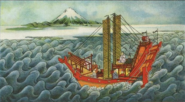 It was a dark and stormy night. A young Buddhist monk named Kukai was aboard one of four ships crossing the East China Sea from Kyushu to Tang China, fearing, as did all aboard, for his life. He prayed for rescue to Munakata Omikami, a goddess of the sea, and also invoked the help of various Buddhas and bodhisattvas. In response he saw the wrathful god, Fudo Myo-o, cutting through the high waves with his sword, ultimately calming the seas so that Kukai’s ship could continue its voyage. The year was 804.