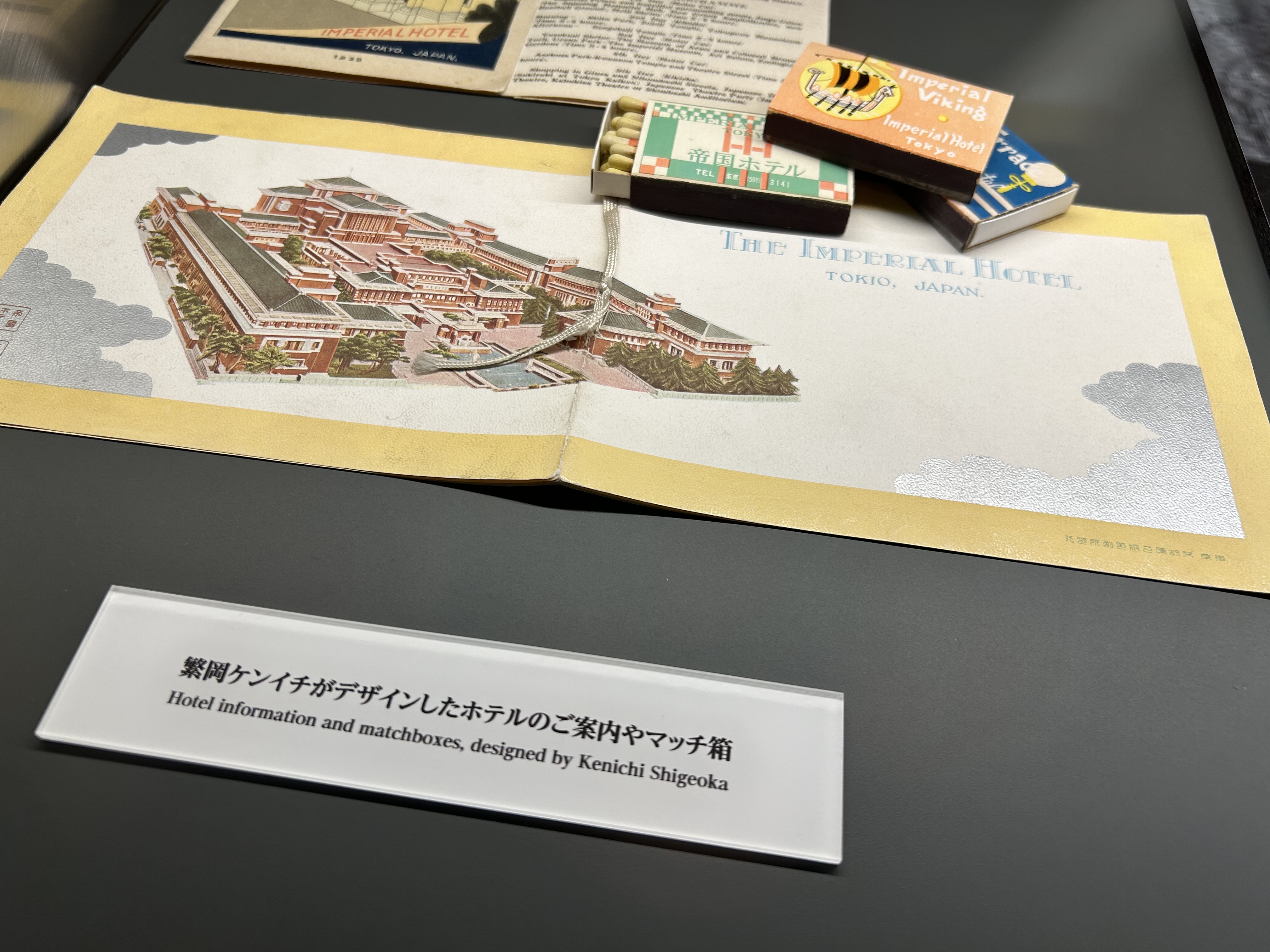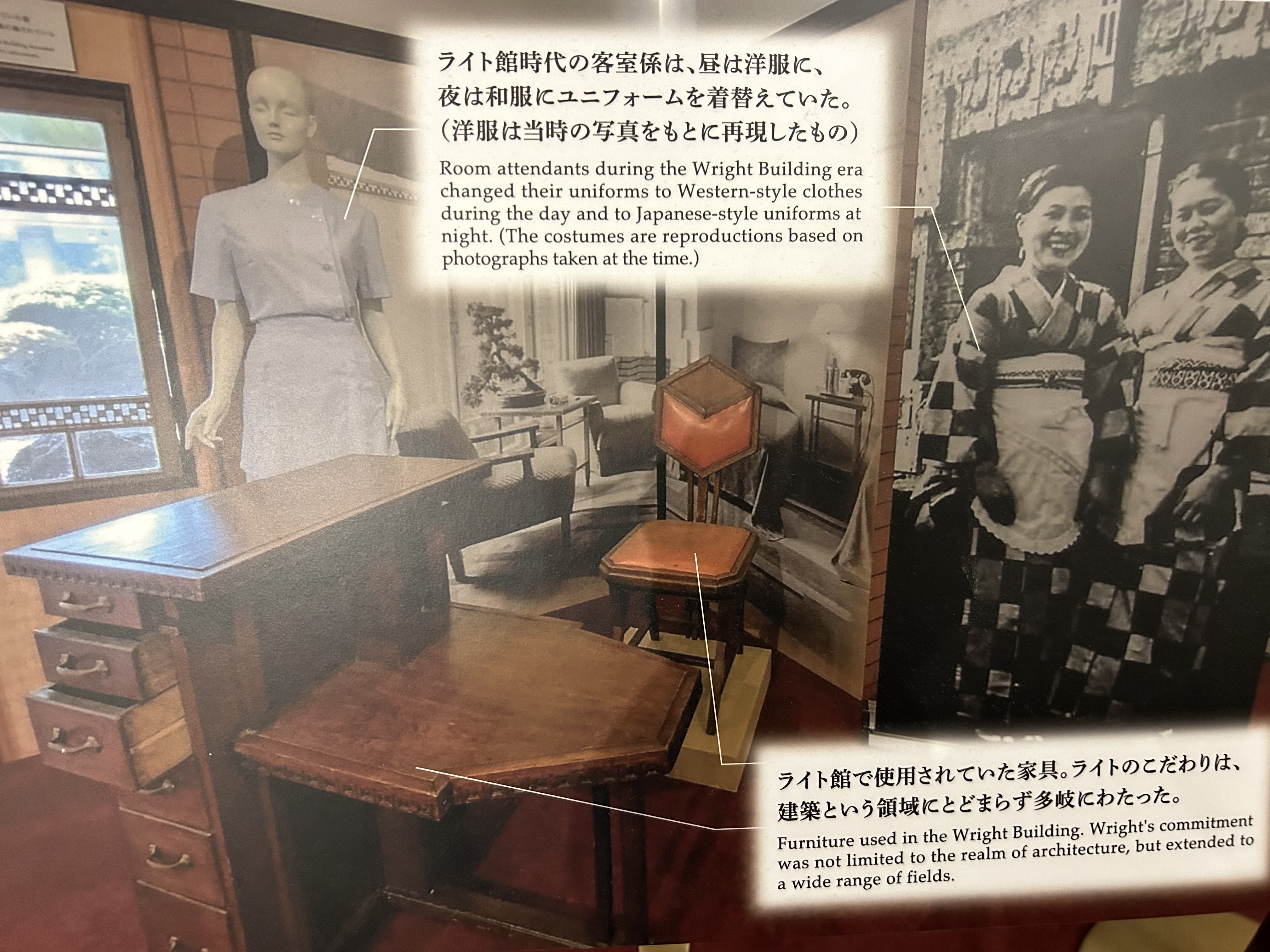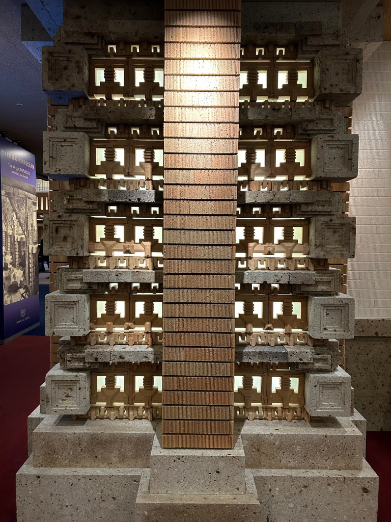 To commemorate the 100th anniversary of Wright’s design, the current imperial hotel has an exhibition in their lobby about the so-called “Wright Imperial”. The exhibition explains various features of hotel style introduced by Wright in his design to highlight not only the structure but the hotel and hospitality practices that shifted because of it.