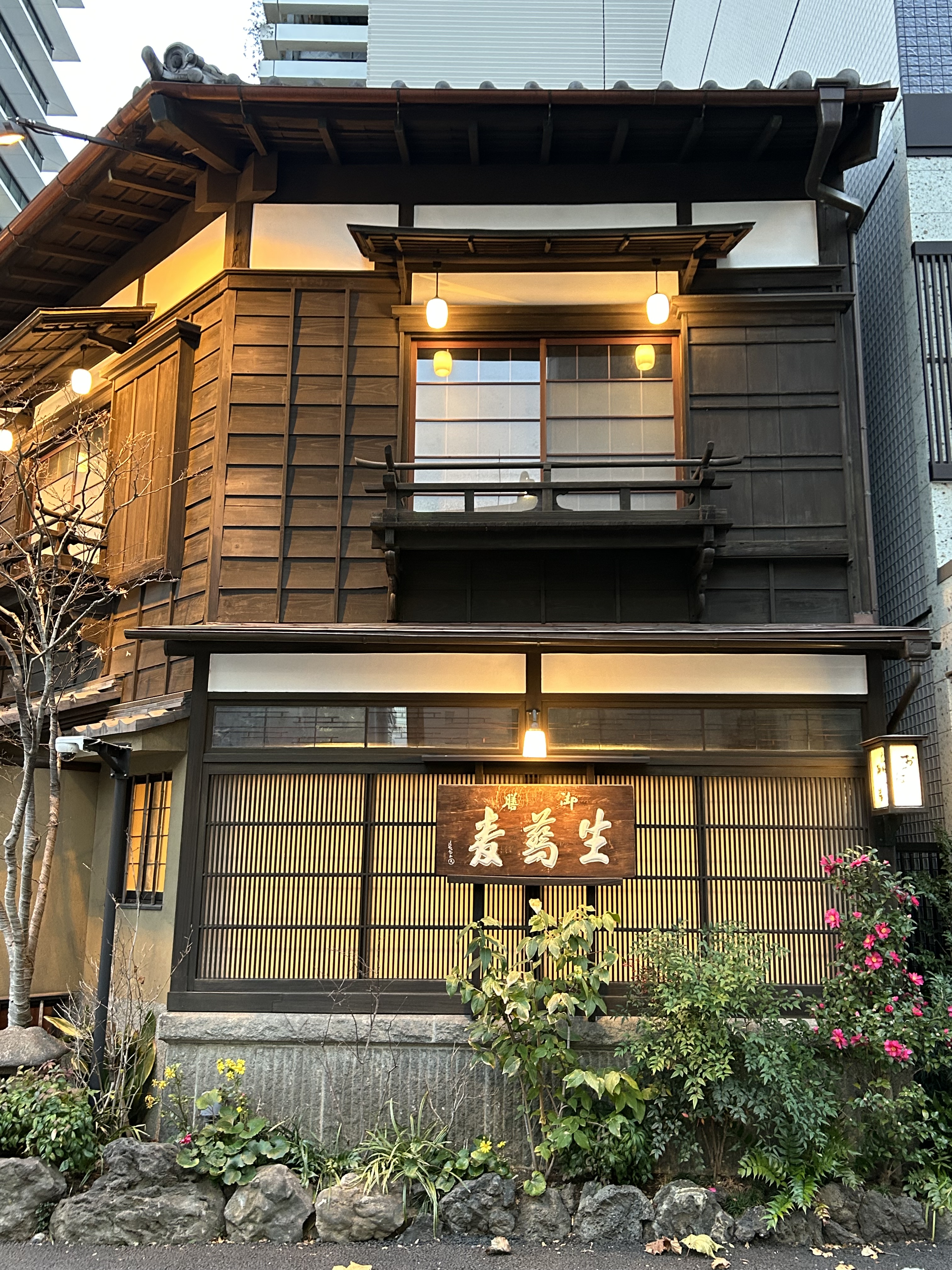 A decrepit-looking delivery bicycle leans again the guardrail outside the restaurant, a nod to the days when bicycles commonly delivered noodles around the city. (Somewhere I have a photo I took in 1980 of a delivery bicyclist balancing a tall stack of trays of noodles on one hand while steering his bicycle with the other.) The bicycle is just a prop and in no way reflects on the food that waits within. The inside is gleaming, well maintained but in the style of 1920s Japan. Although the second floor was closed during our visit, apparently has tatami-matted private rooms.
