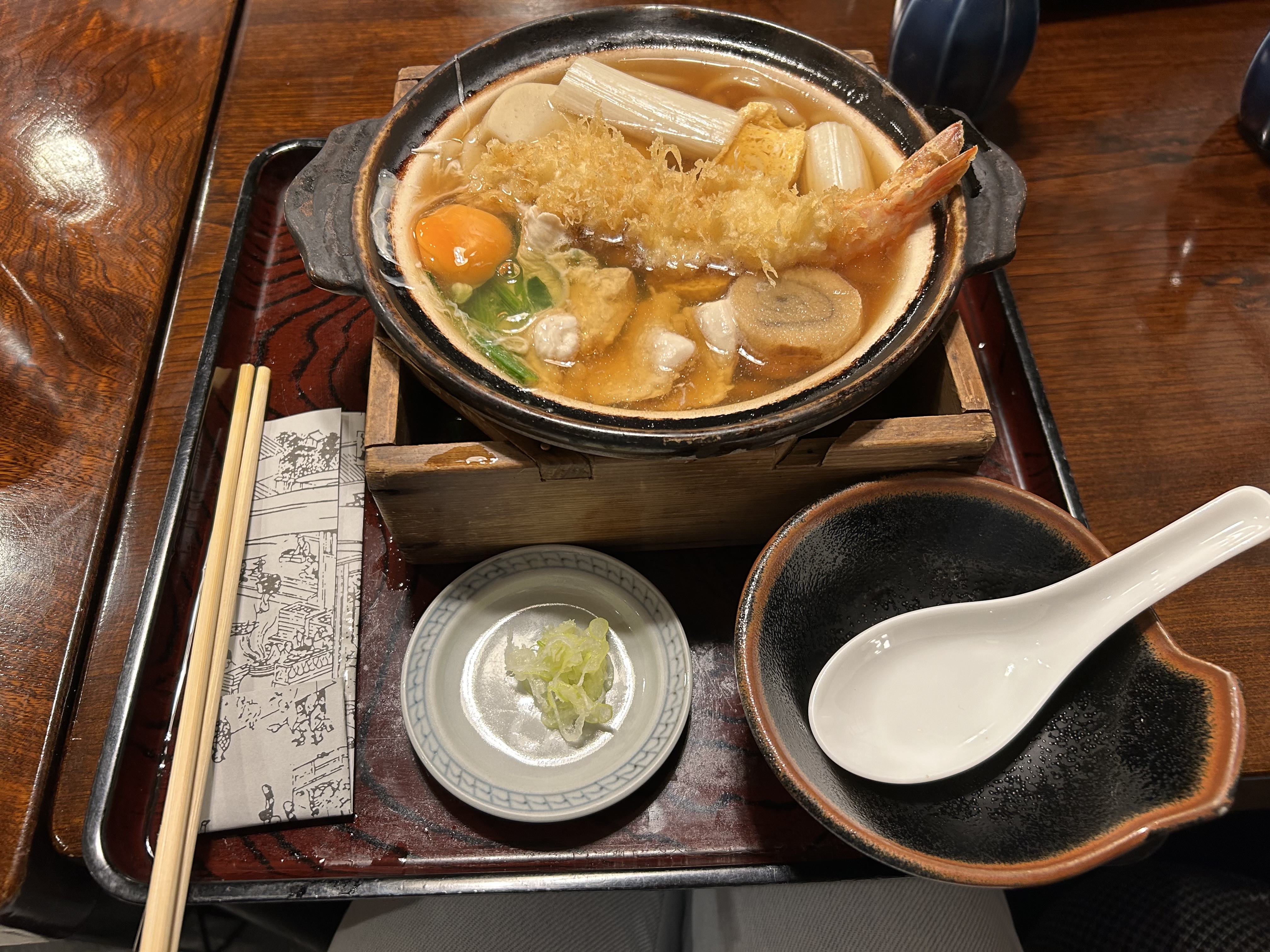 As we examined the menu, Etsuo confessed that his favorite dish at Sunaba was nabeyaki udon, a hearty bowl of fat udon noodles in broth with some vegetables, a tempura prawn and a raw egg. Since 2023 was a pretty good year for me anyway (so that I didn’t feel a strong urge to cut off negatives) and Etsuo made it sound so good, I decided to skip the toshi-koshi soba and go for the nabeyaki udon instead.