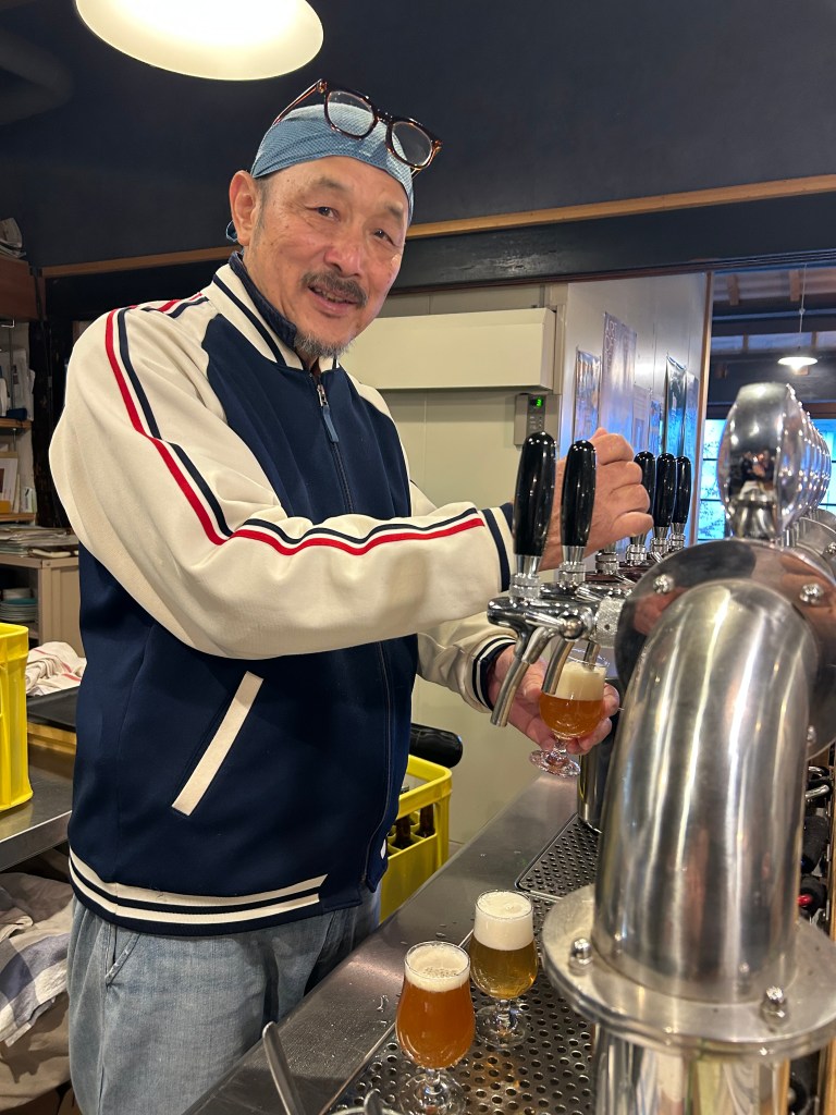 And then I spotted something that had not been there on my last visit: Brew Lab, a little microbrewery and restaurant. I couldn’t resist stepping inside the nineteenth century storefront building to learn more. There I found Tsunemi Fukui and his wife, the owners of this establishment, ready to pull a pint at the bar.